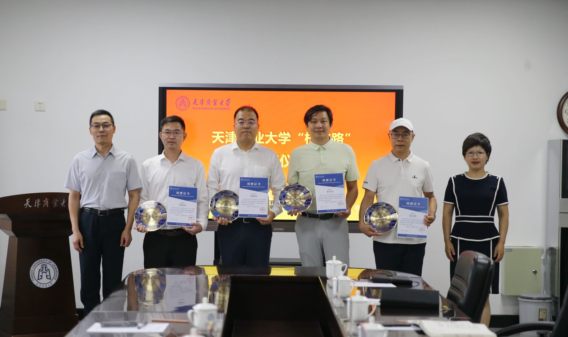 仪式上,校领导为校友代表颁发捐赠证书和纪念品,并与校友共同为校友路揭牌。