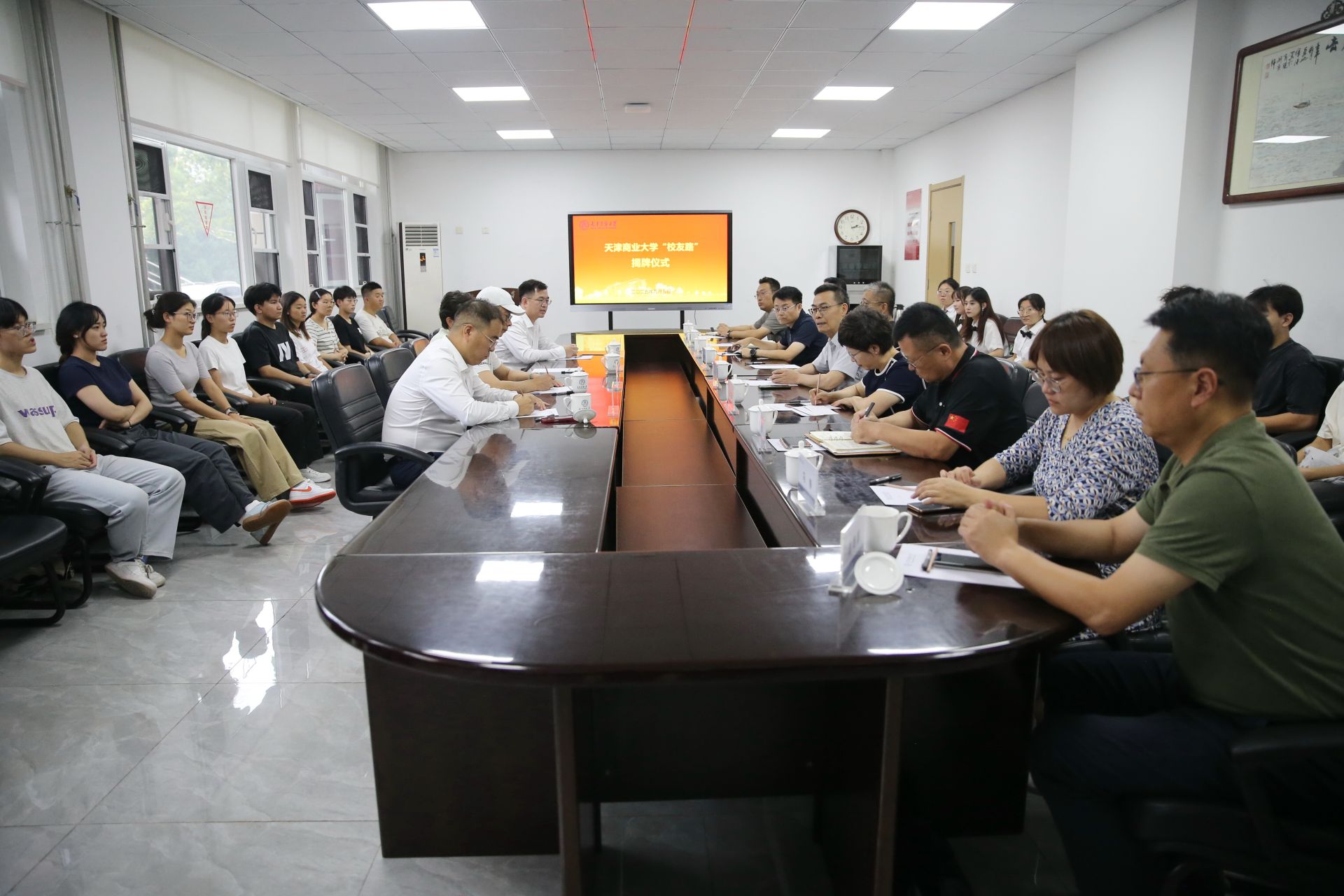 仪式结束后,校领导与校友代表进行了座谈交流。校党委办公室(校长办公室)、党委宣传部(新闻中心)、党委学工部、校友联络服务中心、保卫处、基建处、后勤处主要负责同志及学生代表参加。