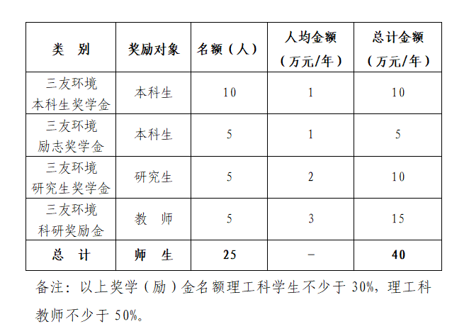 此次设立的“三友环境奖学(励)金”,涵盖本科生奖学金、励志奖学金、研究生奖学金、科研奖励金四大类别,总额度为200万元,分5年实施,每年使用额度40万元奖励优秀师生。奖学(励)金范围及年度资金分配详见下表: