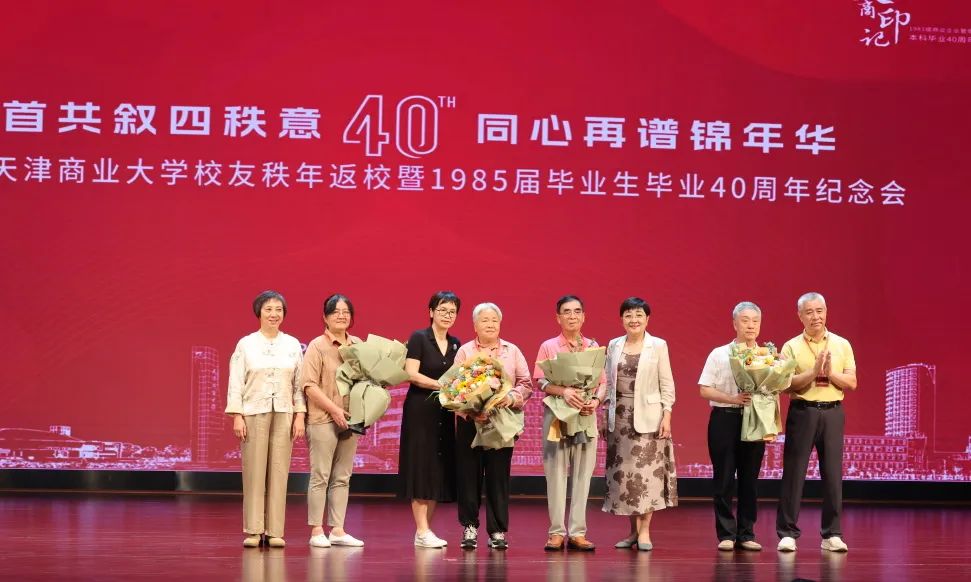 纪念会上,1985届毕业生校友为出席活动的老教师献上鲜花,表达着对母校和恩师的敬意与祝福。