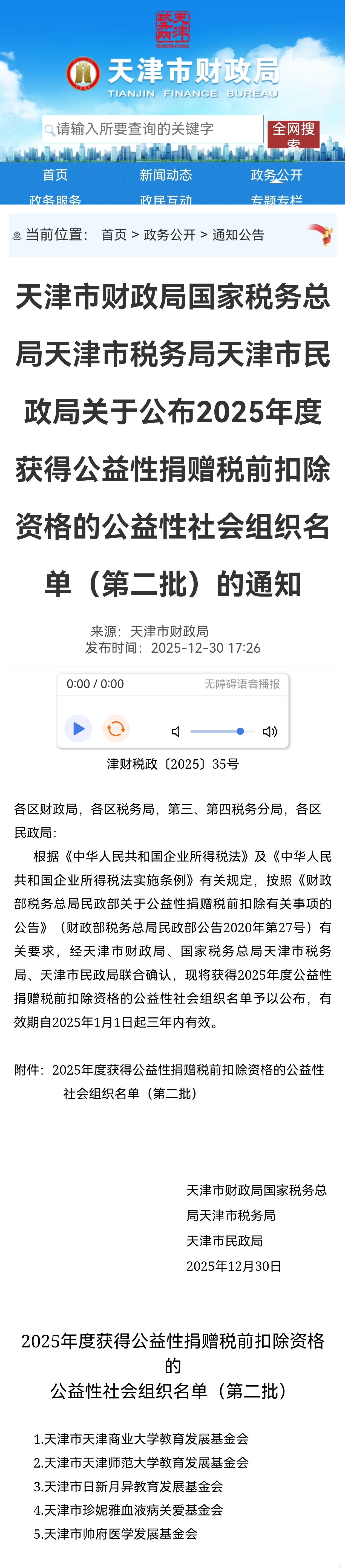 附件: 天津市财政局、国家税务总局天津市税务局、天津市民政局关于公布《2025年度获得公益性捐赠税前扣除资格的公益性社会组织名单(第二批)》的通知(津财税政〔2025〕35号)https://cz.tj.gov.cn/zwgk_53713/tzggx/202512/t20251230_7211785.html